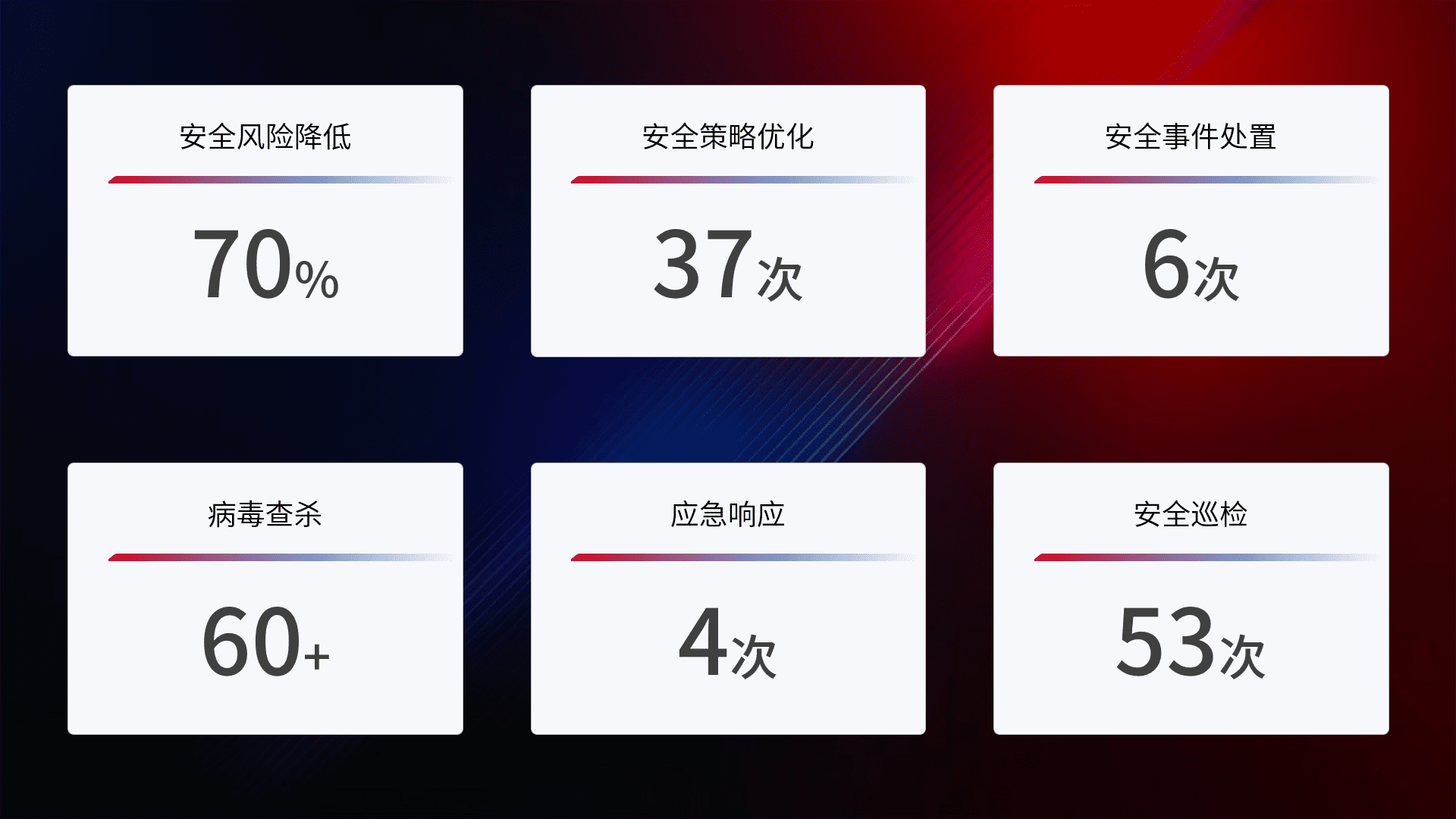 提供全面的安全事件报告体系,,,包括处置报告、、、、周报、、季度和年度总结,,,结合持续监控,,,,帮助客户深入了解网络安全状况。。。。