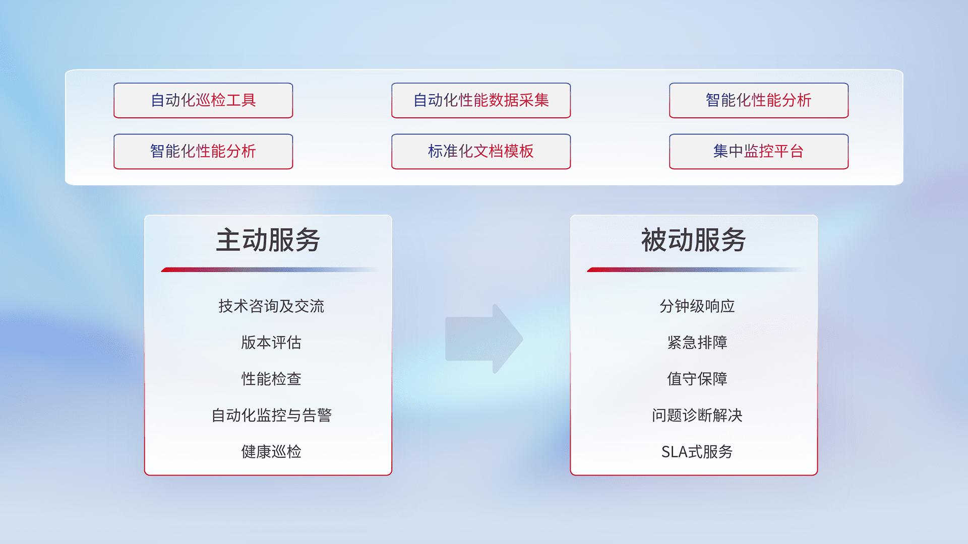 智能化工具和标准化文档,,,保障服务质量,,,提供主动服务(包含技术咨询、、、、版本评估、、性能检查、、、、自动化监控与告警、、、健康巡检)和被动服务包含(分钟级响应、、、、紧急排障、、值守保障、、、问题诊断解决、、、、SLA服务)。。。